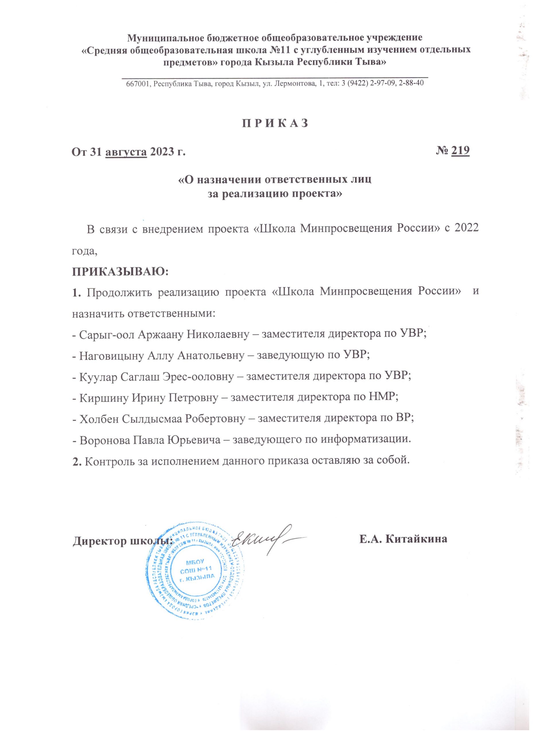 Приказ о назначении ответственных лиц за реализацию проекта
